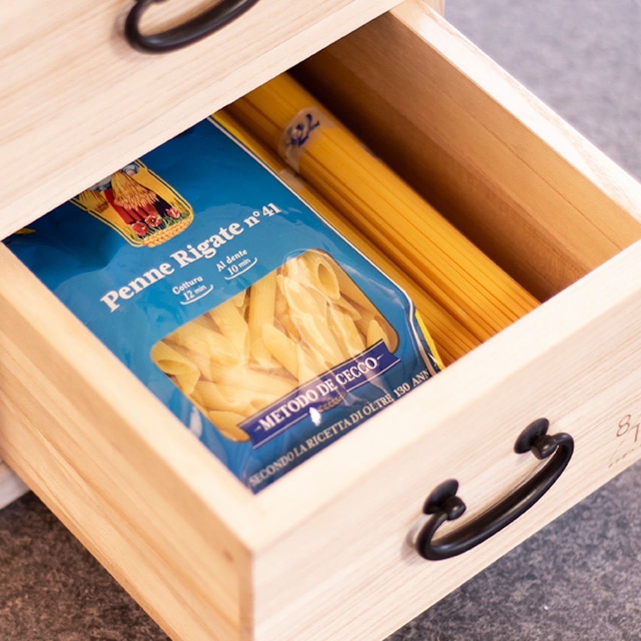 引き出しはパスタがちょうど入る奥行きになっています。